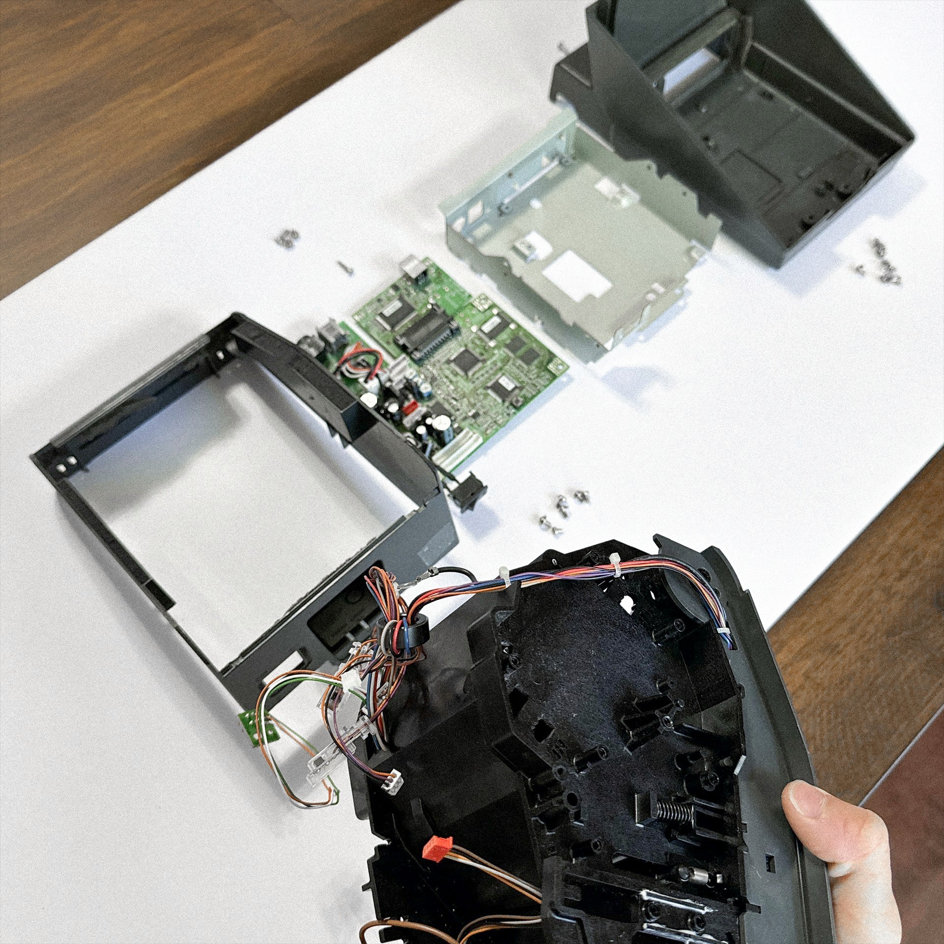 Disassembled an existing receipt printer to understand its structural and material constraints for manufacturing.
