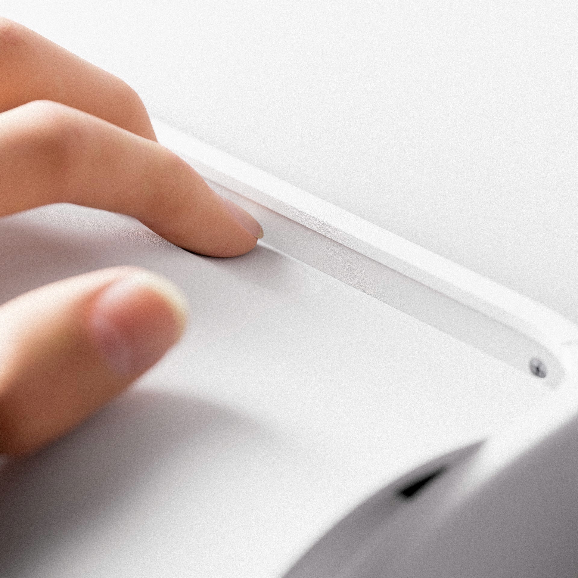 The palm rests naturally on the curve, and a press on the indent opens the cap.