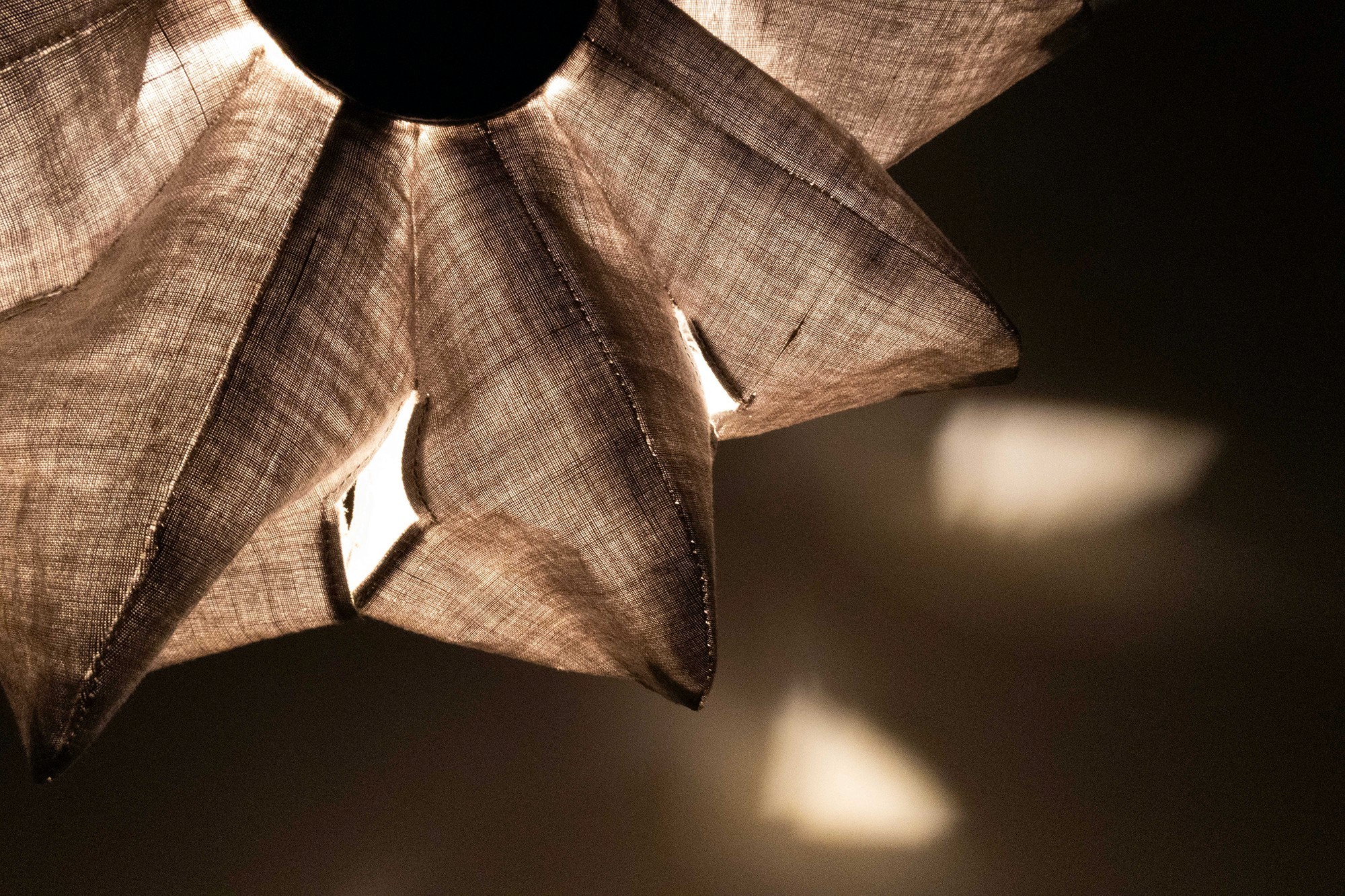 Inspired by constellations, Lume creates delicate patterns across the space. The soft linen hugs the mahogany, adding warmth while gently accentuating the wood's geometric form.