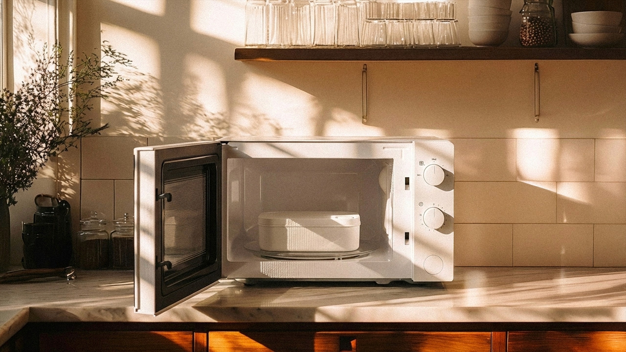 The lunchbox microwaves with the lid closed, containing splatter while the vent releases steam.